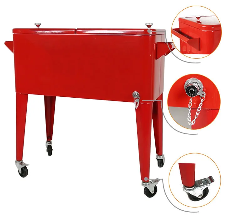 | material | 1. Rooling cooler cart with Bottel Cap-catcher and tray.Has two lids for easy access 2.The lid ,body ,tray and foots are made of steel with powder coated. Inner tank is food pp 3.3”easy-roll wheels include two brakes. 4.Surface coating processing,beautiful and durable. 5.Imported insulation material to keep the temperature. The brand-new insulating layer foaming technique can produce even and dense foams,wihch can keep the temperature for more 72 hours. |