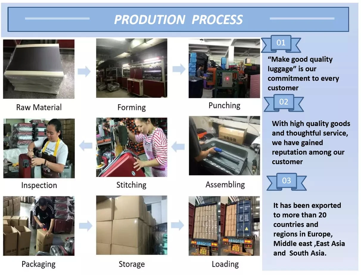 Our main products: ABS, PC, ABS+PC, PP luggage bag, and also luggage bag accessories (trolley system and wheels).Capacity of luggage in 2019 is 1500 pcs per day.