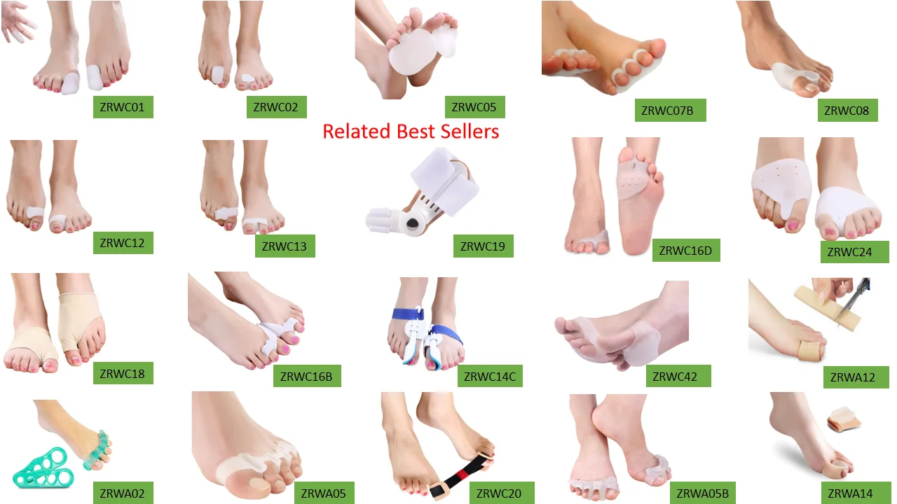 Main items: gel toe separator, hallux valgus splint, bunion sleeves, plantar fasciitis sleeves, orthotic insole, arch support insoles, silicone insole, silicone heel cushion, spa socks, compression socks, wrist support brace, back brace, posture corrector and other Patented items.