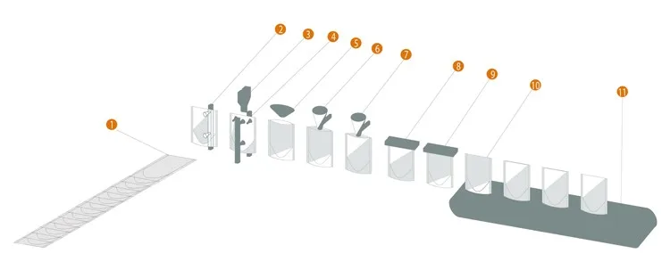 1. Premade Pouch Convryer 2. Fit-Out Pouch -Picking Unit 3. Zipper Opening 4. Pouch Opening 5. Air Flushing 6. First Filling 7. Second Filling 8. Top Seal I 9. Top Seal II 10. Finished Product 11. Outlet