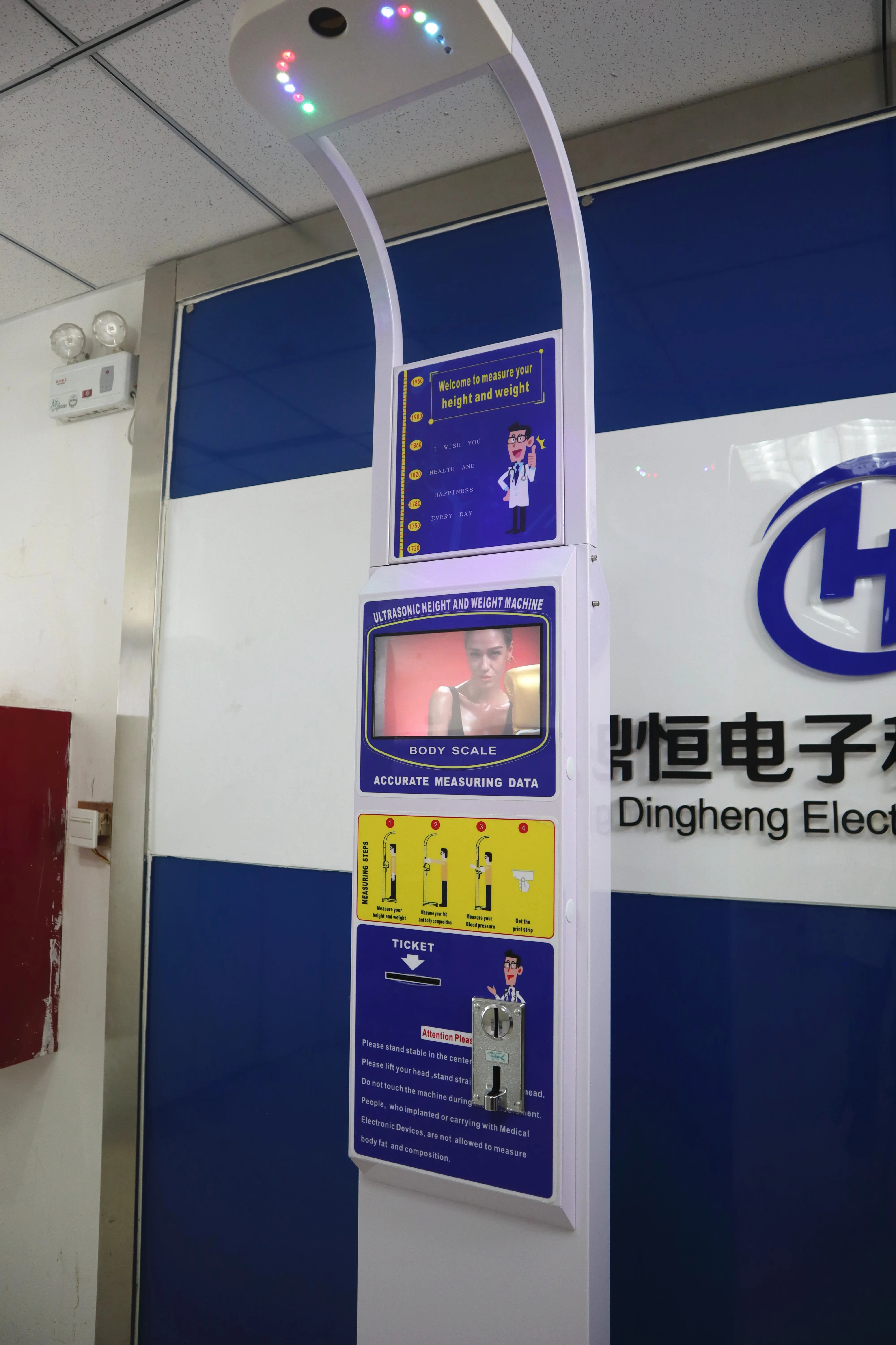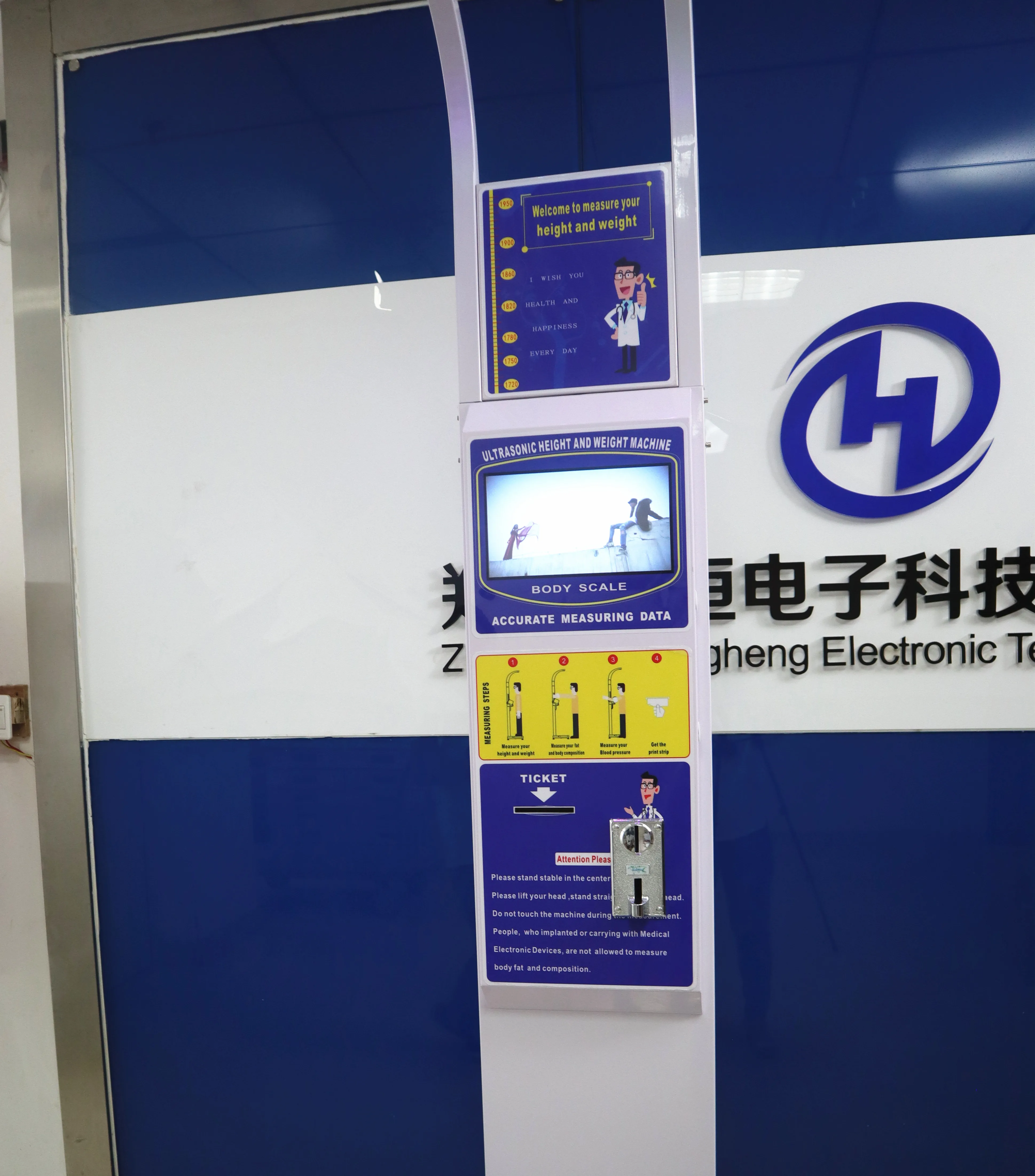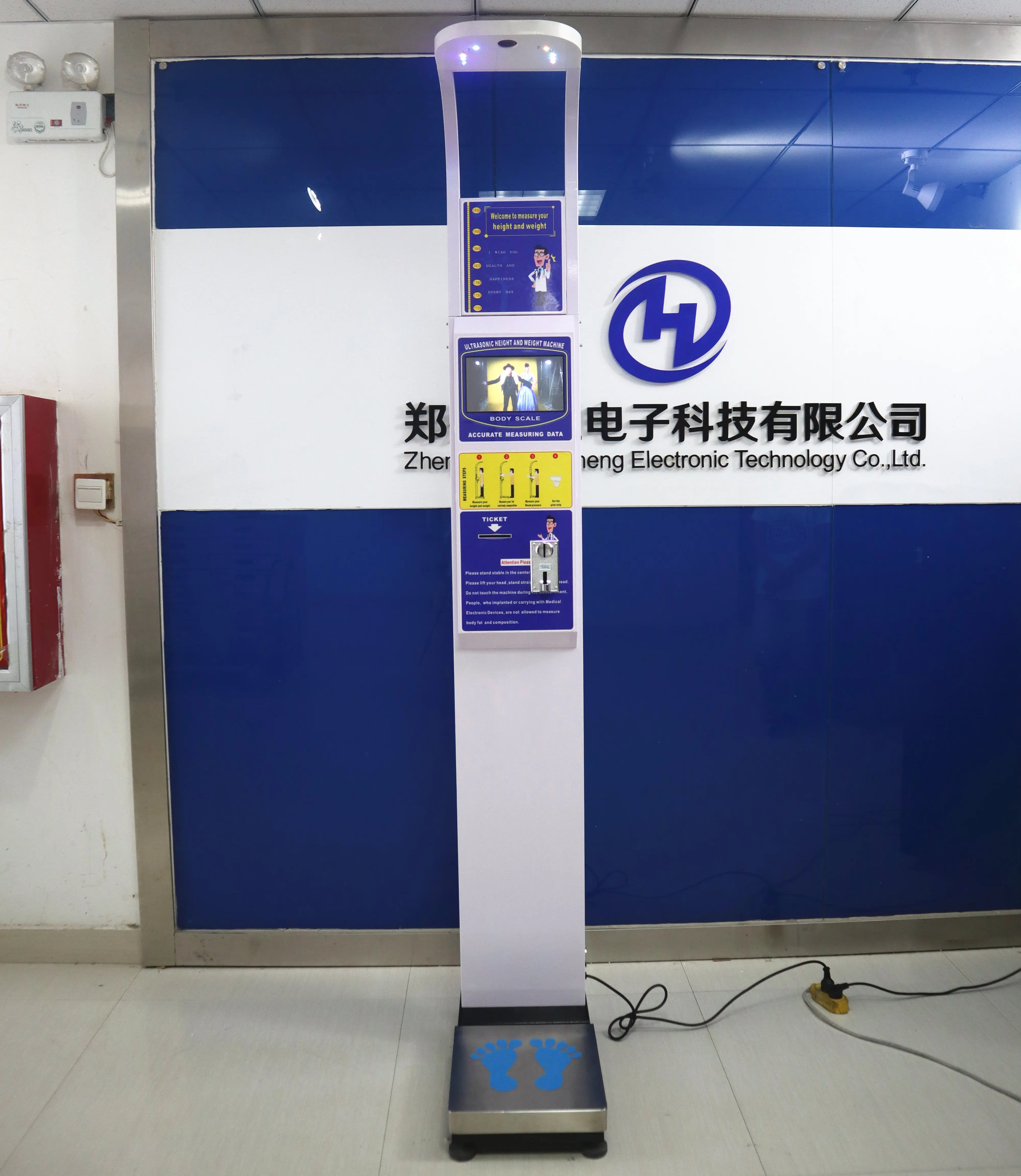 Functions | Height ,weight ,BMI Coin or paper money operated Body Temperature(Optional and custom-made) Voice broadcast and Printing the measuring result by thermal printer 19 or 10 inch LCD Advertisement Screen(Optional and custom-made) Land wheel Connected with computer by wired Rs232 interface(Standard) or wireless WIFI and Bluetooth (Optional and custom-made) |