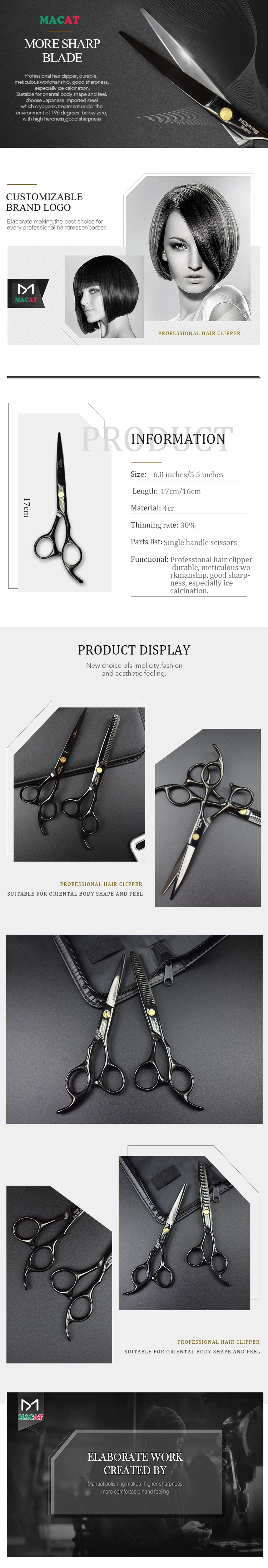 | Characteristics | Professional haircut, durable,meticulous workmanship,good sharpness,especially using ice calcination treatment. Suitable for body shape and feel. Special stainless steel production,moderate length,convenient overall and local shape trimming |