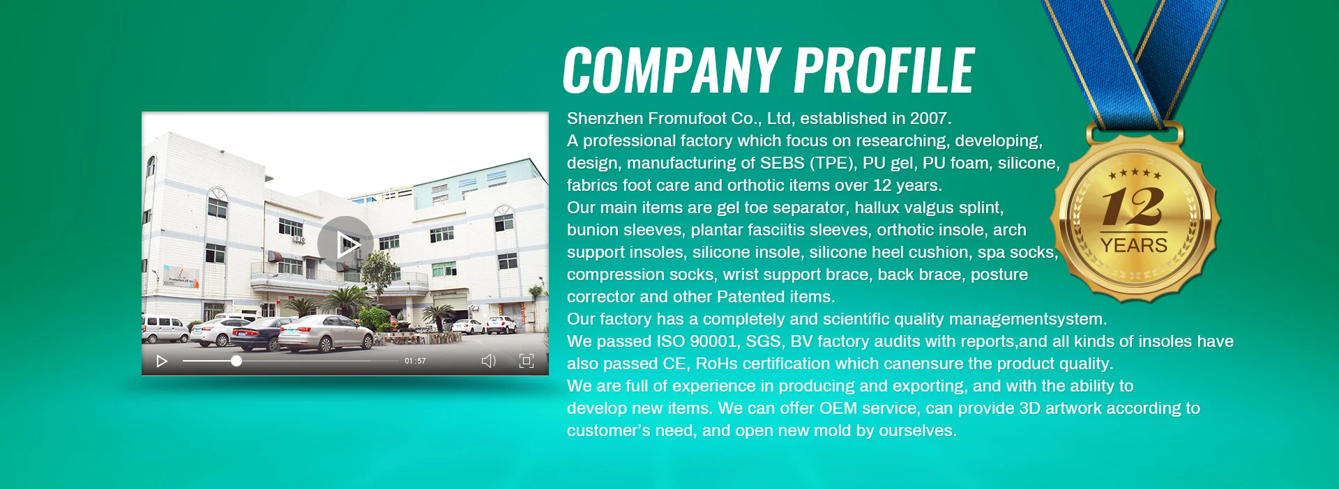 Main items: gel toe separator, hallux valgus splint, bunion sleeves, plantar fasciitis sleeves, orthotic insole, arch support insoles, silicone insole, silicone heel cushion, spa socks, compression socks, wrist support brace, back brace, posture corrector and other Patented items.