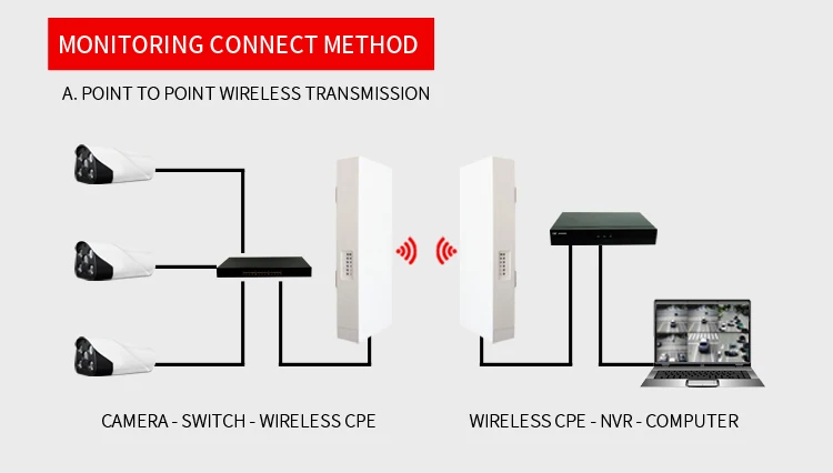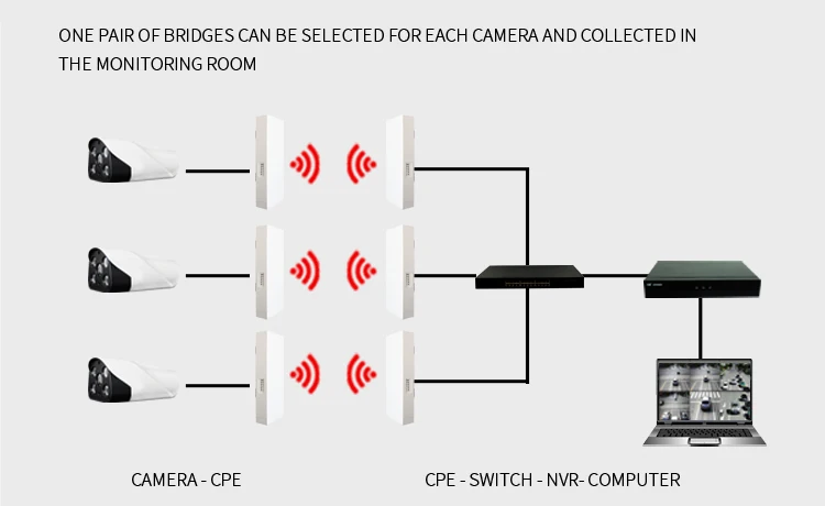 To solve the trouble of wiring, WQ-580L can be used for outdoor wireless cctv project. Install WQ-580L (Station mode) at each camera side and WQ-580L (Access point mode) at NVR side. Connection method is as follows.