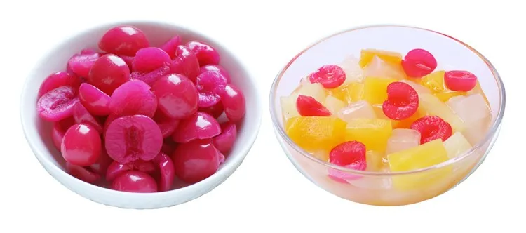 Harvested, washed and pitted by ourselves, produced by our factory. With mature world leading dyeing technology, our cherries will not lose color, if you match it with other food, colors that are independent of each other will make the food look more exquisite, it is really a great choice for sauces, parfaits, brownies, cake, and canned mix fruit...