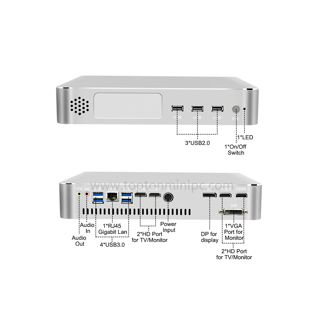 - 2xSODIMM DDR4 memory slot up to 32GB more powerful performance improve work efficiency and give you a smooth experience. - H310 Motherboard and GTX1050 2G or GTX1050TI 4G Graphics for option. - Brushed Aluminum Alloy Black/Silver color shell, Exquisite production craft on outside design. - Support DP+HDMI+DVI display output synchronously. - Can install M.2 SSD and 2.5” SATA HDD together.
