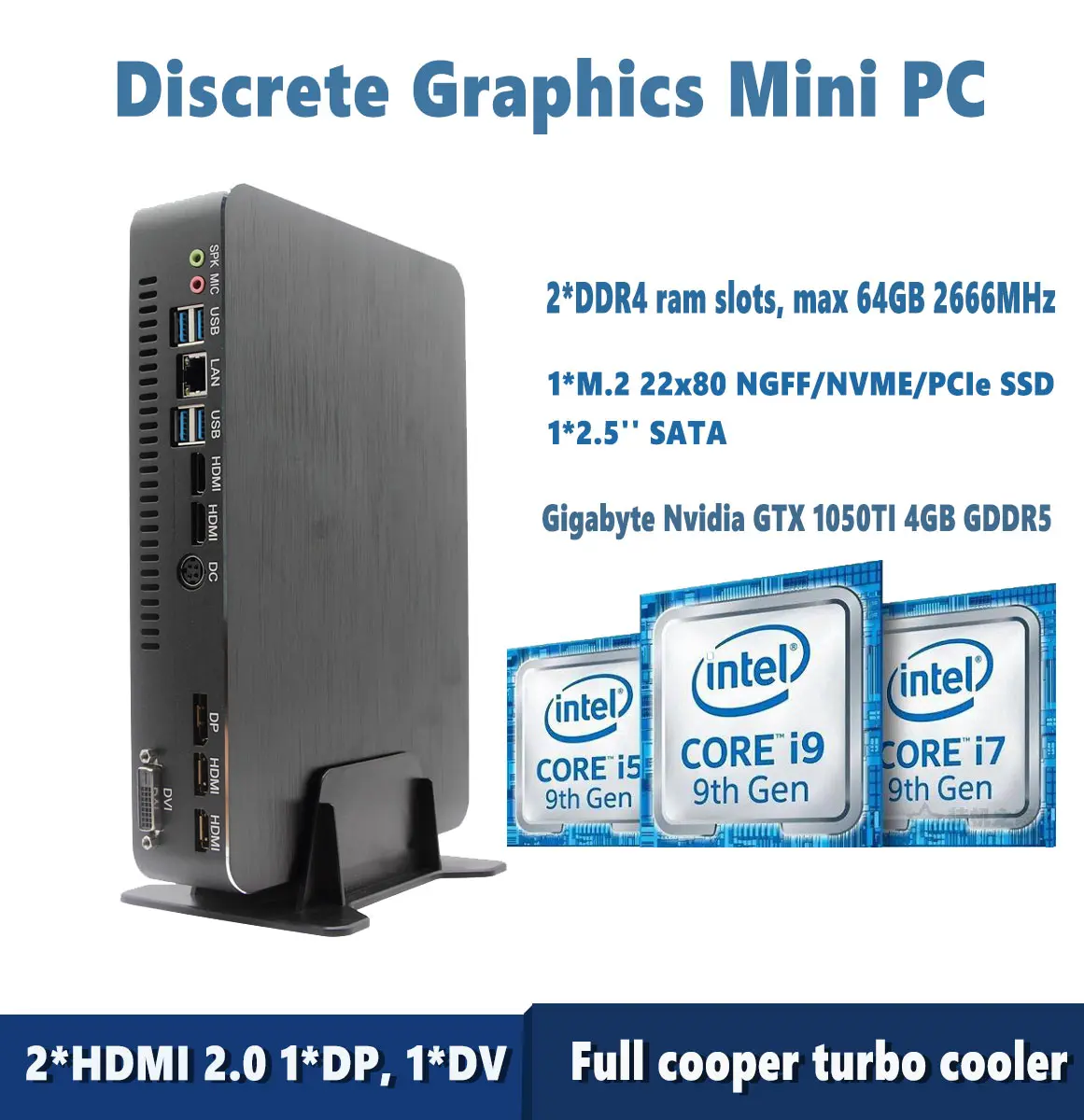 Motherboard: B360 Memory: 2*DDR4 ram slots, max 64GB 2666MHz Storage: 1*M.2 22x80 NGFF/NVME/PCIe SSD+1*2.5'' SATA Graphic card: Gigabyte GTX 1050TI 4GB GDDR5 Video ports: 2*HDMI 2.0(2 of 4*HDMI is invalid), 1*DP, 1*DVI, max 4*displays Network card: RTL8XXX series Gigabit Ethernet+2.4G/5G AC WiFi USB: 4*USB3.0+3*USB2.0 Heat-sink: Full cooper turbo cooler Power Supply: 19V 9.5A Color: Black/Sliver