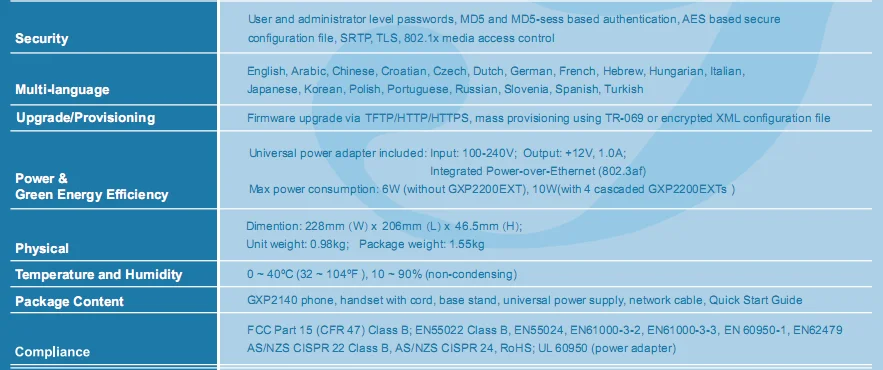 As all Grandstream IP phones do, the GXP2140 features state-of-the-art security encryption technology (SRTP and TLS). The GXP2140 supports a variety of automated provisioning options, including zero-configuration with Grandstream’s UCM series IP PBXs, encrypted XML files and TR-069, to make mass deployment extremely easy.