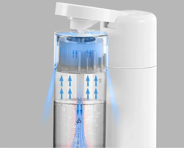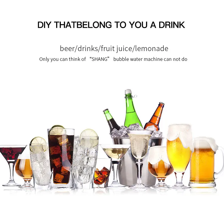 1.Look cool:slim is new sexy – the trendiest design 2. Sparkle anything:applicable to carbonate all Mixed Drinks (Juice, Coffee, Cocktail, ect.) 3. Safe and easy to use: super convenient with one-hand operation; quick bottle fixing; time saving by 50% 4. 2-step gas relief: avoid overflow for mixed drinks 5. Washable detached injection pipe: avoid fruit or sugar particles blocking 6. Two auto-relief Valves + two manual relief valves to minimize the risk of blocking