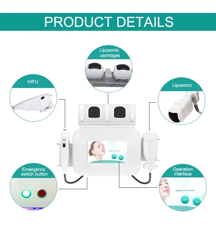 | Technology | 3 hifu heads(1.5mm,3.0mm,4.5mm) 1)1.5mm for forehead cheekbones. 2)3.0mm for neck,cheeklifting. 3)4.5mm for cheek lifting. 2 liposonix head 8/13mm for body slimming,weight loss. |