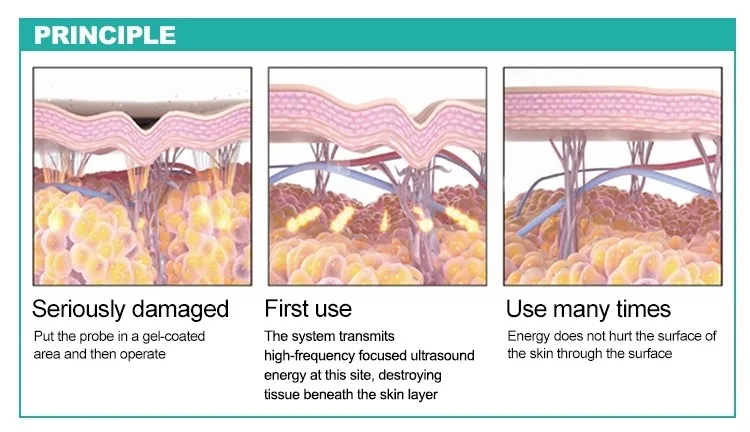 By focusing on treatment of HIFU technology, deep subcutaneous 1.3 cm for treatment, interfere hot cells of subcutaneous fat, use heat destroy the subcutaneous fat permanently, reduce fat at the same time, directly stimulate the collagen contraction and thickening, quickly fill the after melting fat, make the skin smooth and water embellish as before.