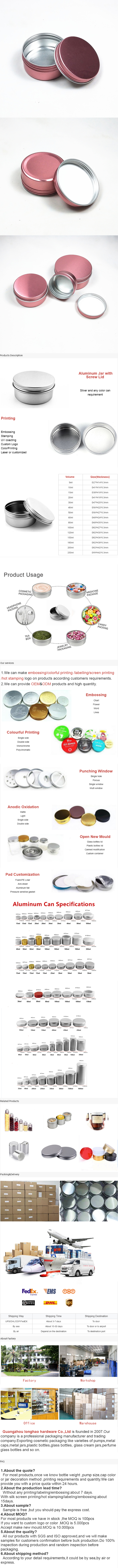 5g10g15g20g30g40g50g60g80g100g120g150g180g200g250g Aluminum jar ,We can do Laser/Full color/Embossed logo.Get quotation please contact us.