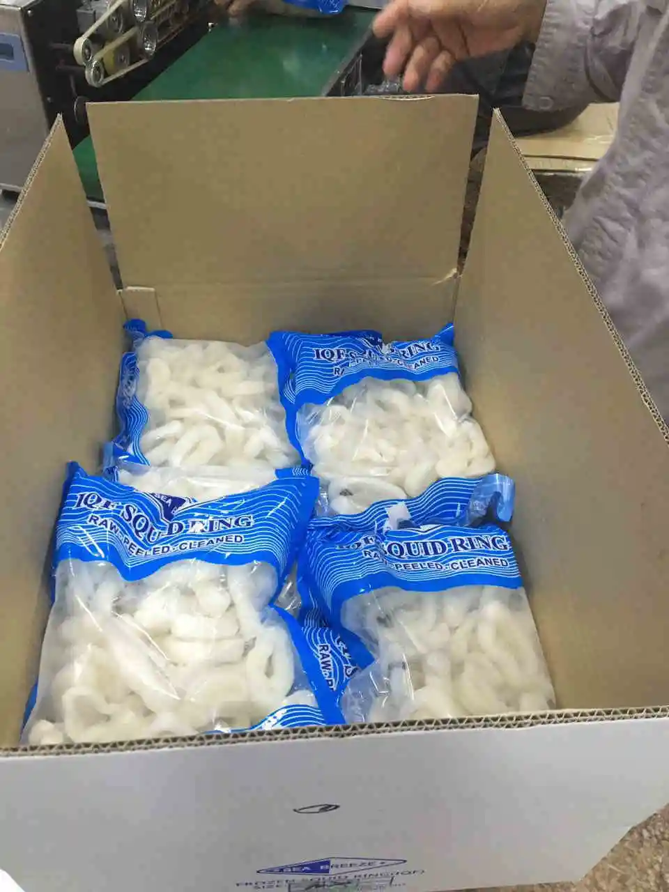 After glazing,Frozen boiled indian ocean squid ring with yellow spot off are packing.