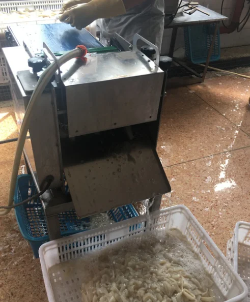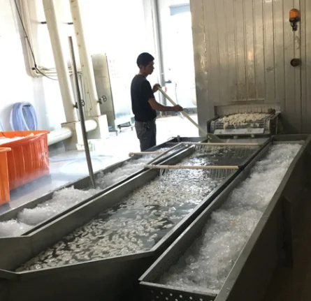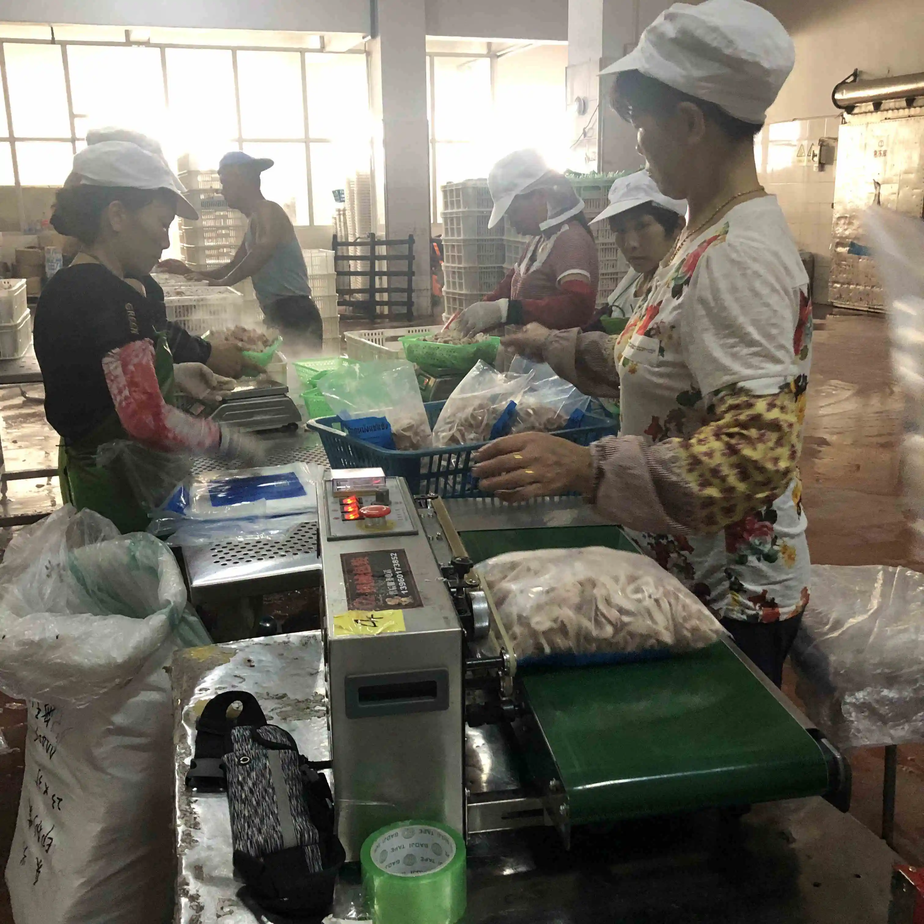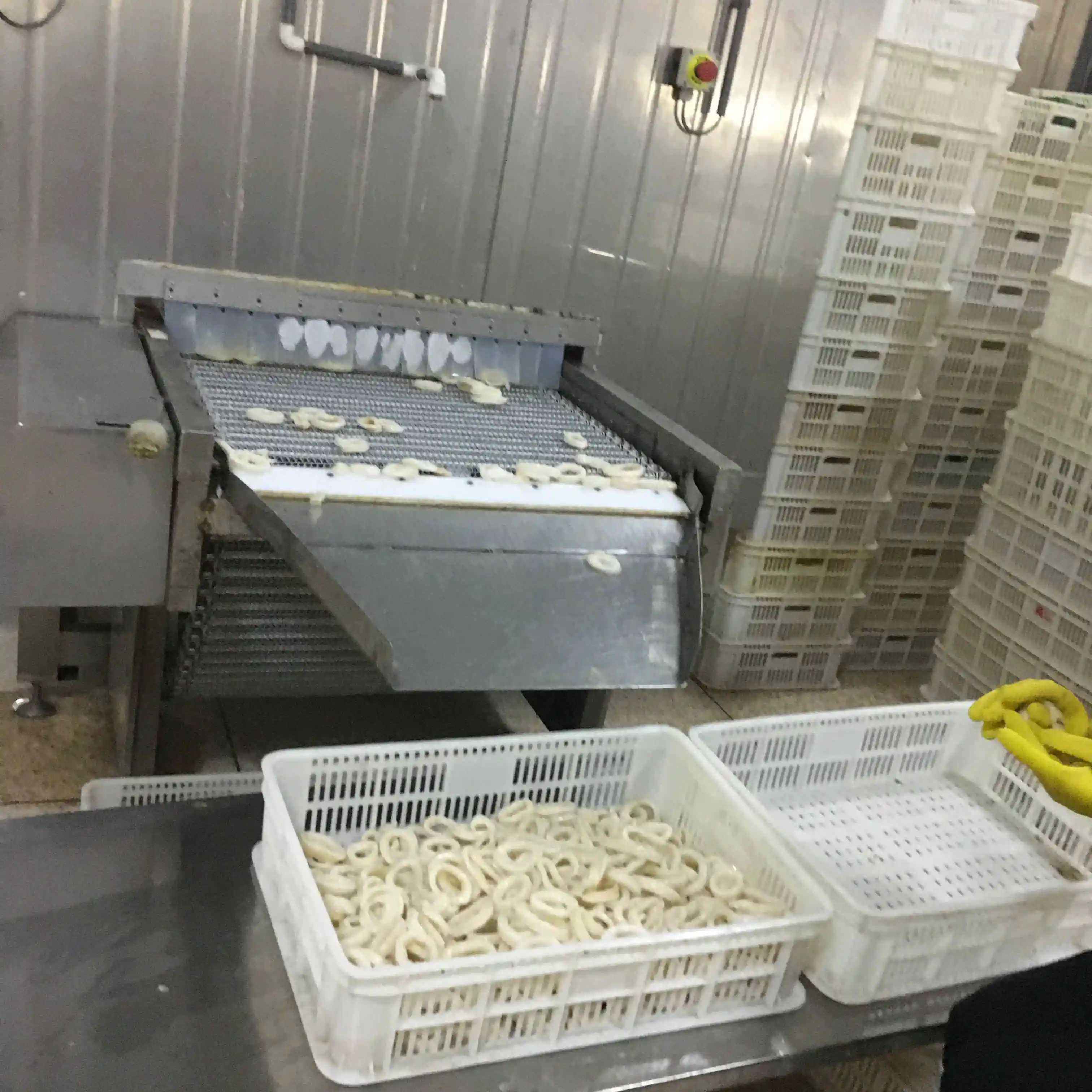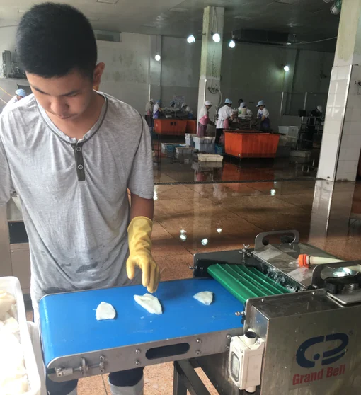 The process of worker are putting the indian ocean squid on the IQF machine