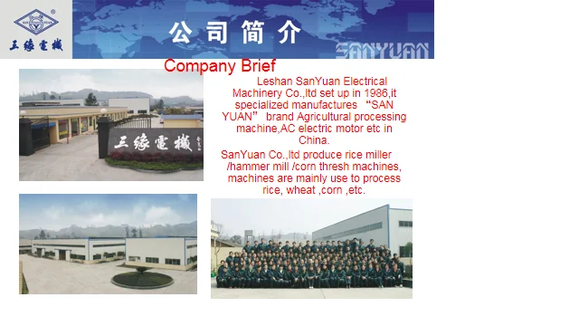 Leshan SanYuan Electrical Machinery Co.,ltd set up in 1986,it specialized manufactures “SAN YUAN” brand Agricultural processing machine,AC electric motor etc in China.