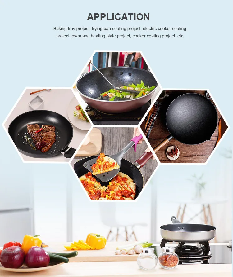 Non-stick Coatings | Water type | Appliances, kitchen, auto parts | 180~380℃ | Excellent adhesion to the substrate, imparts abrasion resistance to the substrate; excellent adhesion and smoothness |