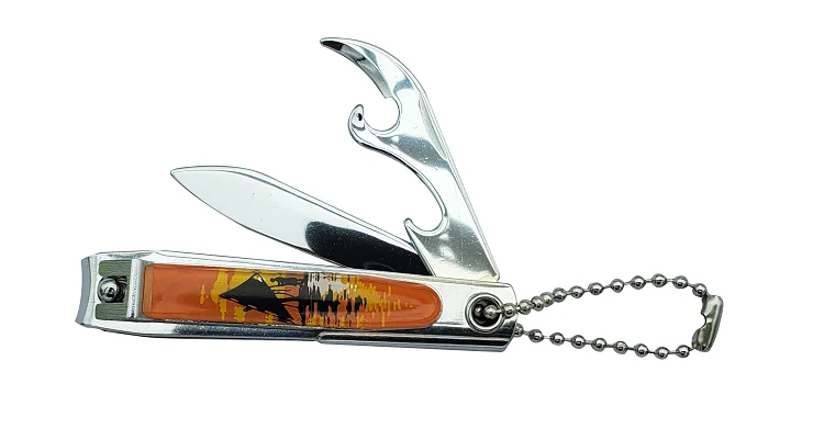This product is made of carbon steel, first class quality nail clipper with bottle opener and folding knife, a handy item for both indoor usage and traveling.
