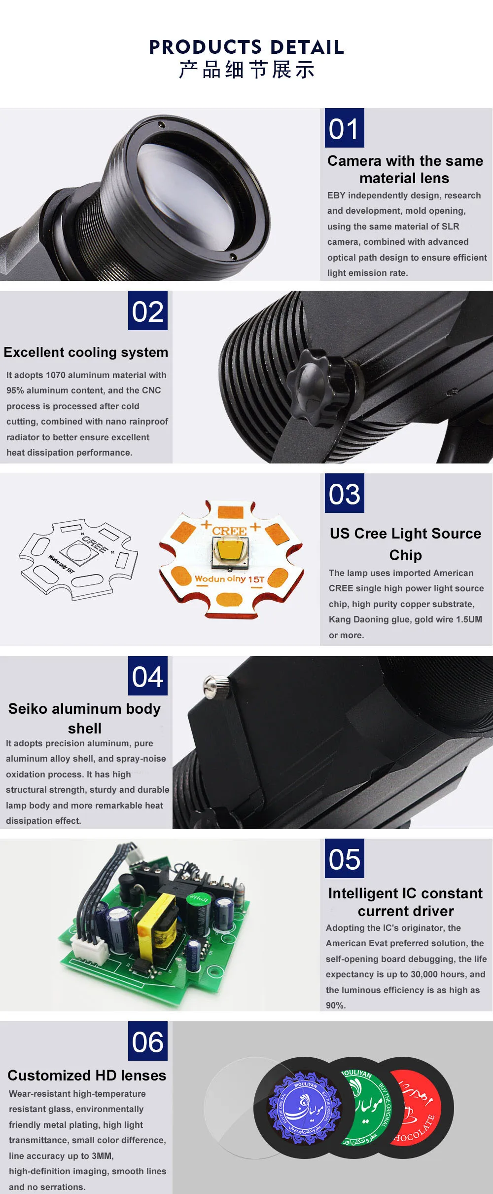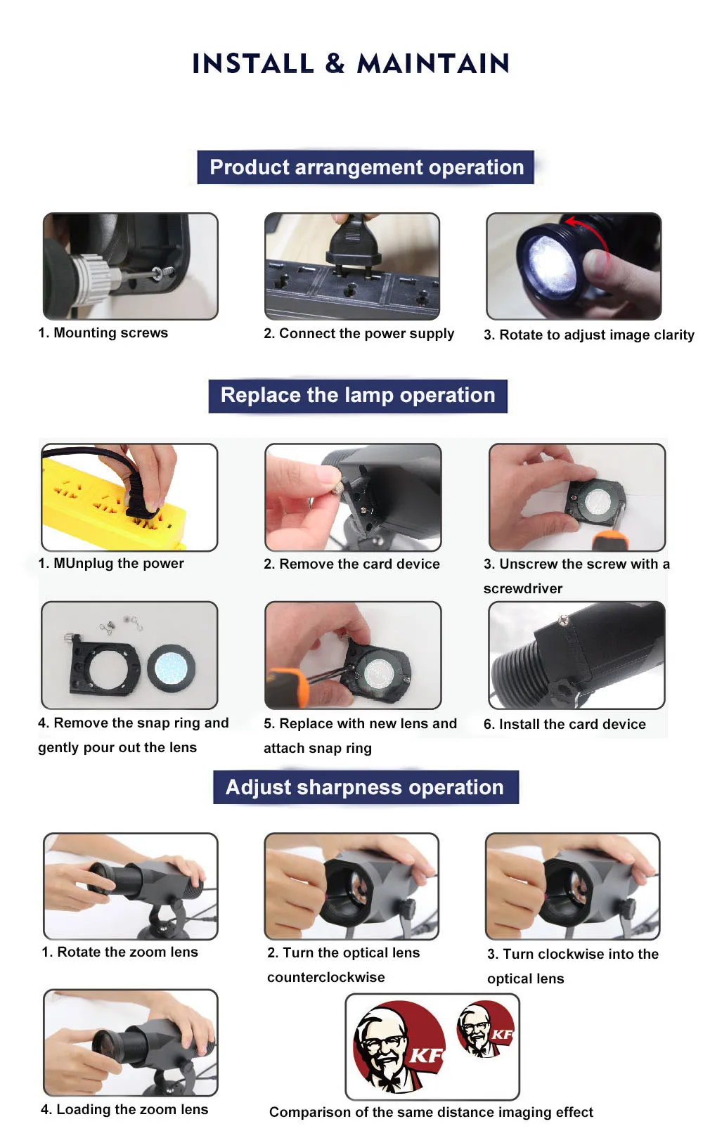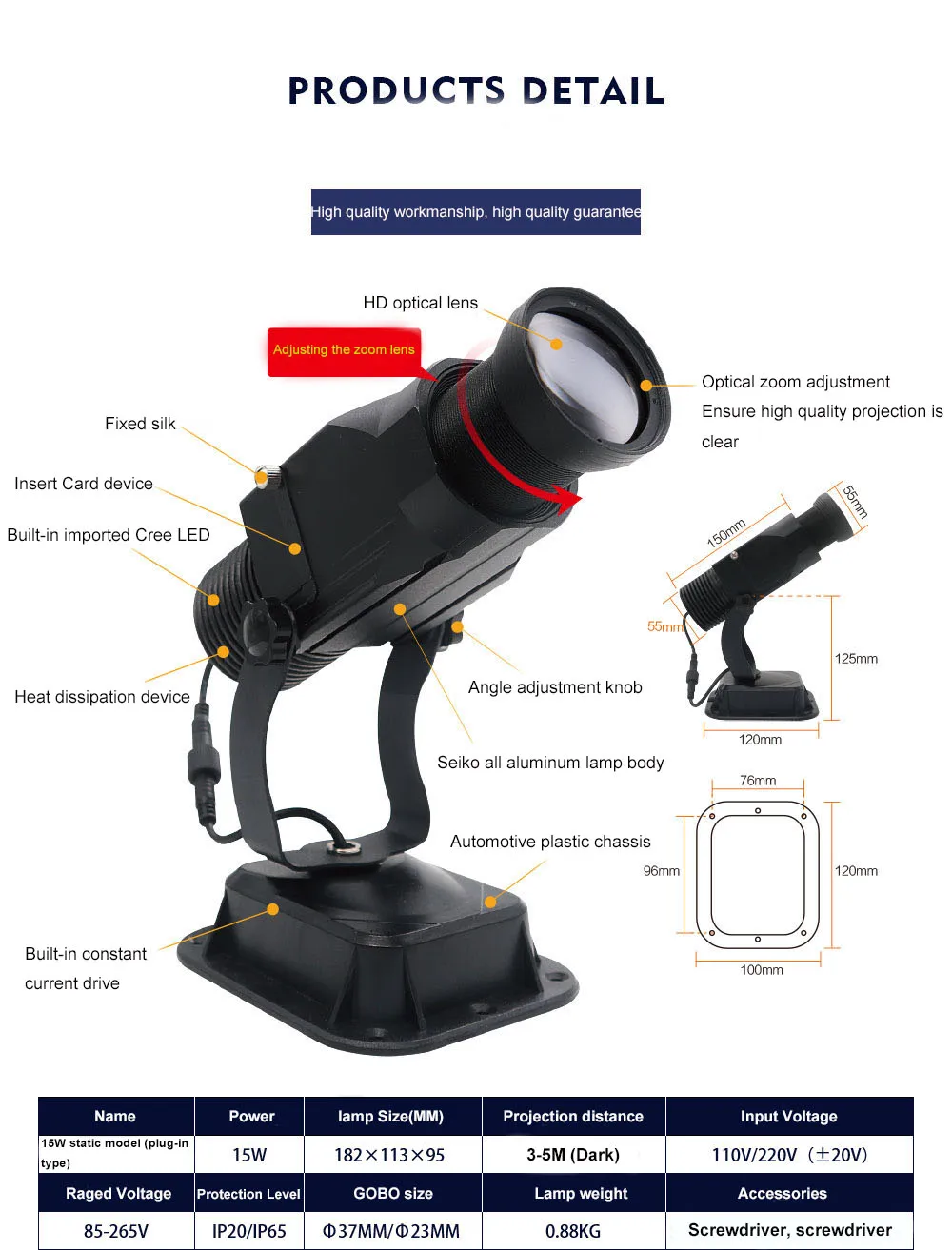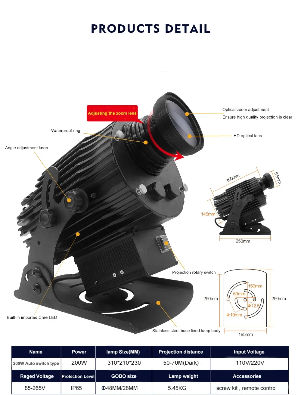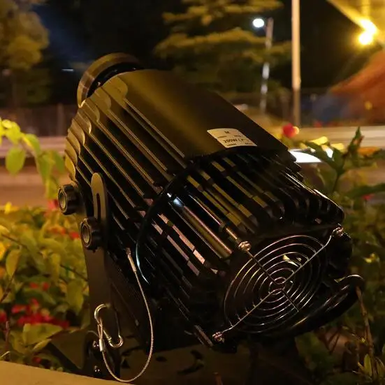 Input: 100V - 240V / 50 - 60 Hz LED lamp (made USA): 5000 lumens and 6000K color temp. Lamp life: 30000 hours Default lens: 15/25/45 degrees Material: rustproof aluminum Working temperature: -20 to 50 ℃ Recommended projection distance:within 20 meters on dim/dark occasion Manual focus, ensuring clear projection at all distance. Feature: rotating image