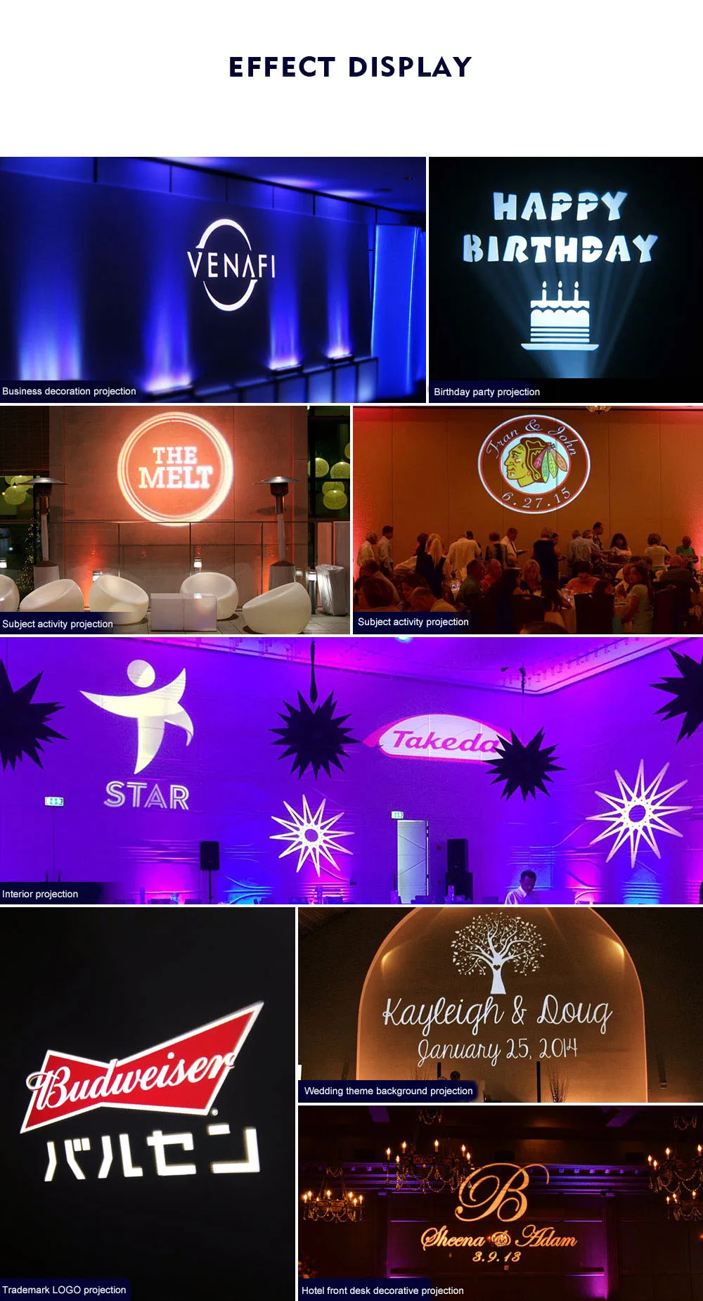 Logo projection lamp product description: static logo projection lamp: refers to the projection pattern is stationary; dynamic rotation logo projection lamp: refers to the projection pattern is rotated 360 degrees clockwise in place; ceiling-mounted logo projection lamp: refers to It is fixed installation, directly screwed to fix.