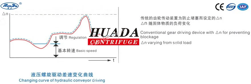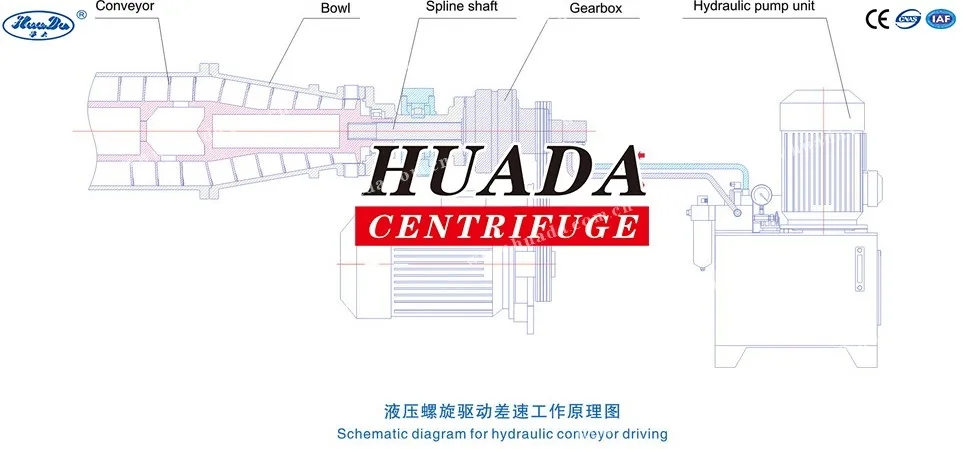 The hydraulic conveyor gearbox is connected with the bowl of the decanter centrifuge, both of them rotates in high speed. The spline shaft on the gearbox rotor is connected with the conveyor, and rotates in different speed driven by the high pressure oil, that's we call the differential speed. The conveyor gearbox is connected with the hydraulic pump by flexible hose, so there is no need of gearbox between the bowl and conveyor. Conveyor torque gives pressure to the hydraulic system. With the action of such pressure, the different speed can by adjusted by adjusting the oil supply and flow rate.