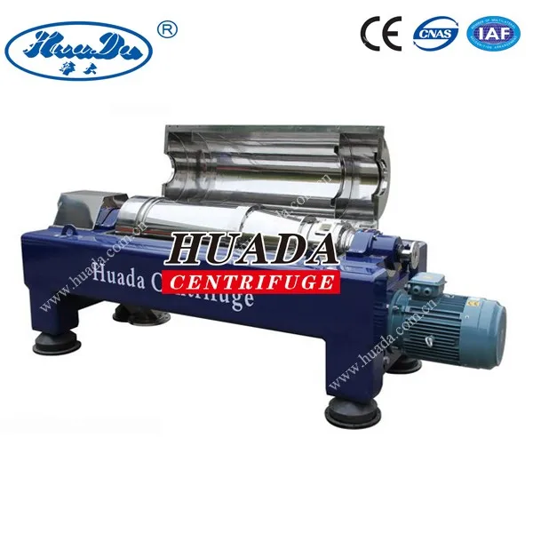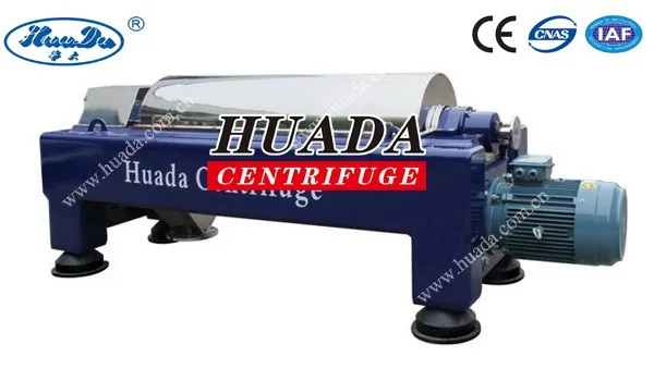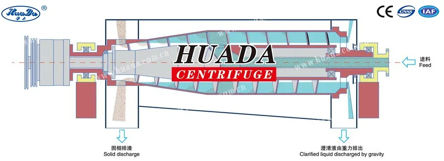 Labyrinth seal is used for both bowl ends of LW standard type decanter centrifuge, simple and convenient, after separation, the solid phase is conveyed to the solid discharge port by scroll conveyor, and discharged out of centrifuge under centrifugal force caused by high speed rotation; while the liquid phase drains out under gravity and centrifugal force through the overflow plate. This series decanter centrifuge features easily operation, continuous and stable running, and wide application scope.