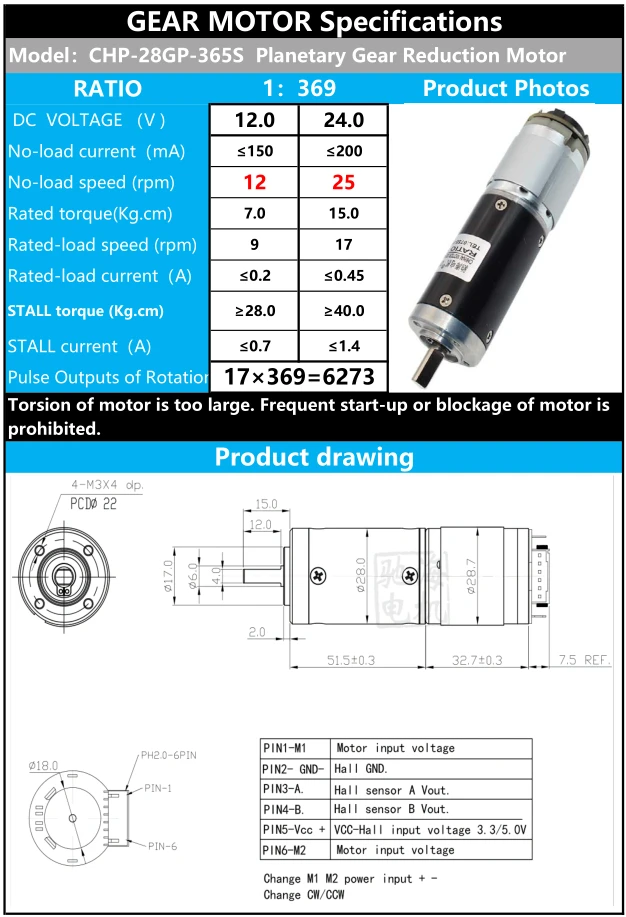 product model: | CHP-28GP-365S permanent magnet DC planetary gear reduction motor with encoder | ||||||