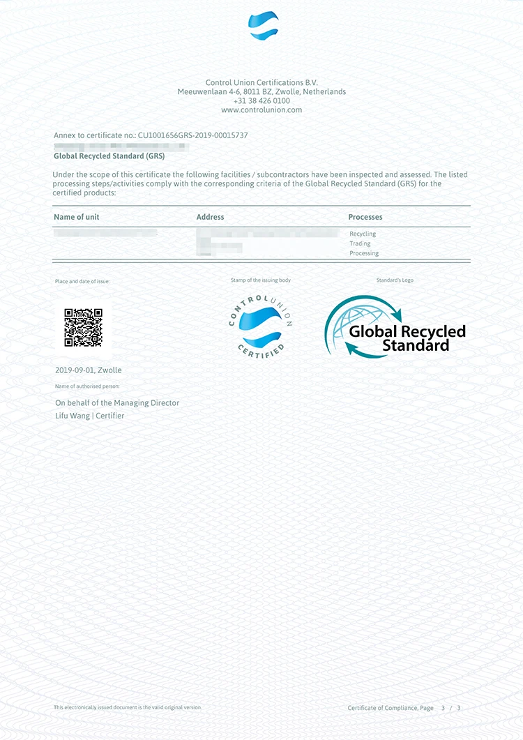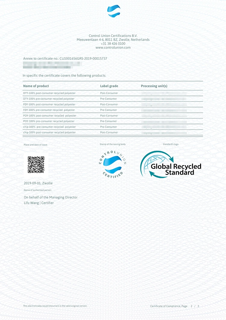 One ton of recycled PET yarn = 67,000 plastic bottles = 4.2 tons of carbon dioxide reduction = 0.0364 tons of oil saving = 6.2 tons of water saving
