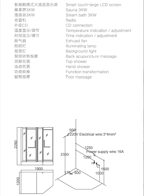 Size | 1700*1200*2280mm 1850*1300*2280mm 1900*1200*2280mm | Style | wet and dry sauna | |||