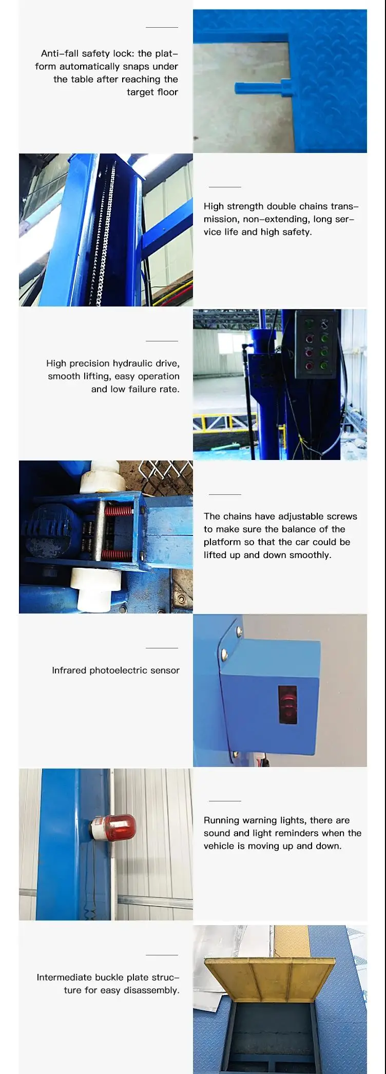 This product mainly consists of posts, tray,transmission beam, chain safety device,oil cylinder,hydraulic pump station,etc.To raise the lifter, just press motor button. To lower down the main unit, toggle down the handle of the manual directional control valve at the pump station to unload oil cylinder and lower down the tray.