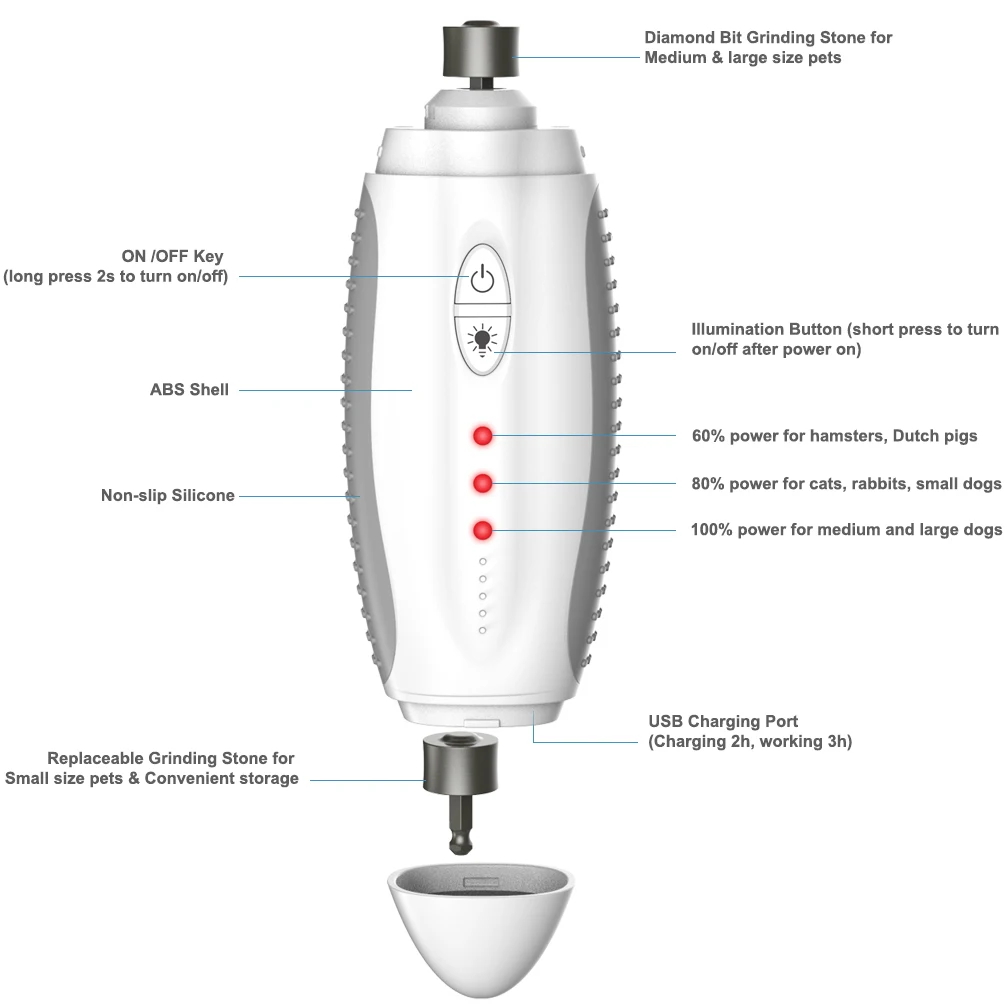 Application | 60% power (5400r/s) for hamsters, Dutch pigs; 80% power (7200r/s) for cats, rabbits, small dogs; 100% power (9000r/s) for medium and large dogs |