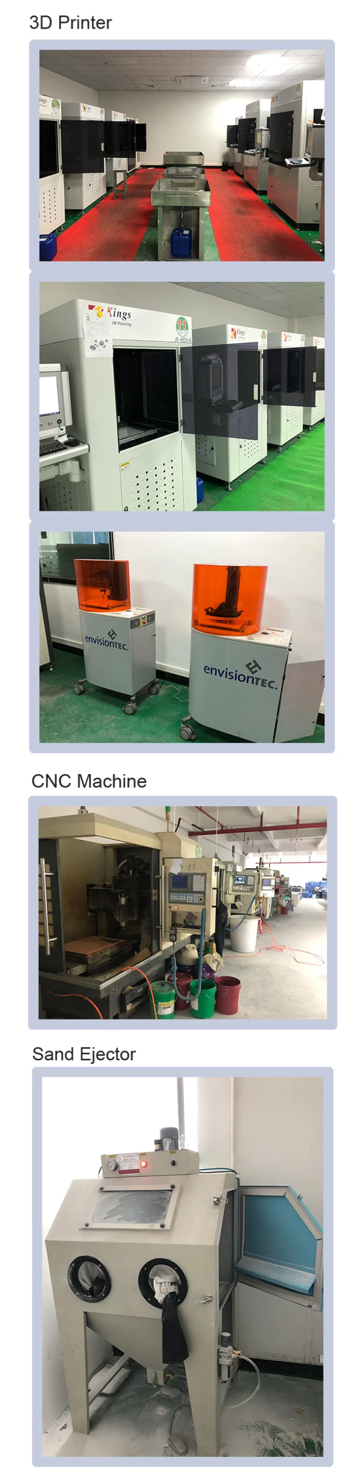 The production equipment included CNC machines with 10 sets,3D printer more than 20 sets of different types and our own professional designer, engineer team with rich experience.