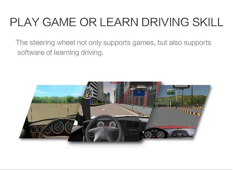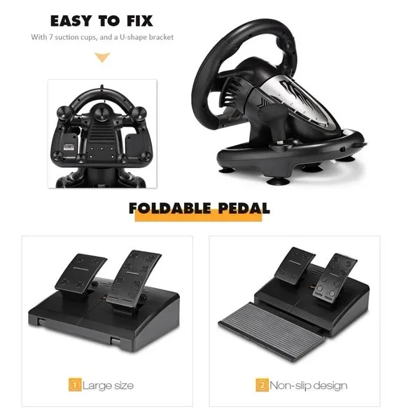 This is a 180 degree wired gaming racing wheel with big size pedals, fixing clamp and suction cup.
