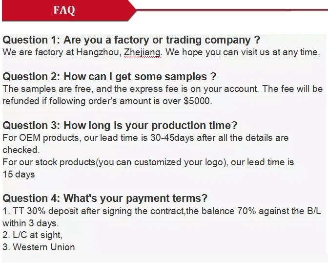 | Payment: | 1. T/T with 30% deposit, and balance before shipment or again B/L copy 2. L/C at sight 3. Western Union |