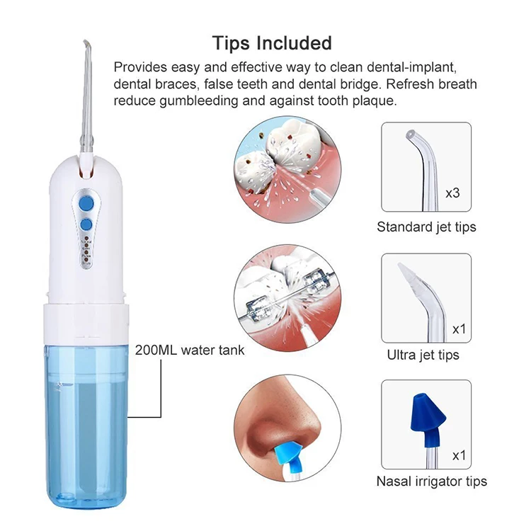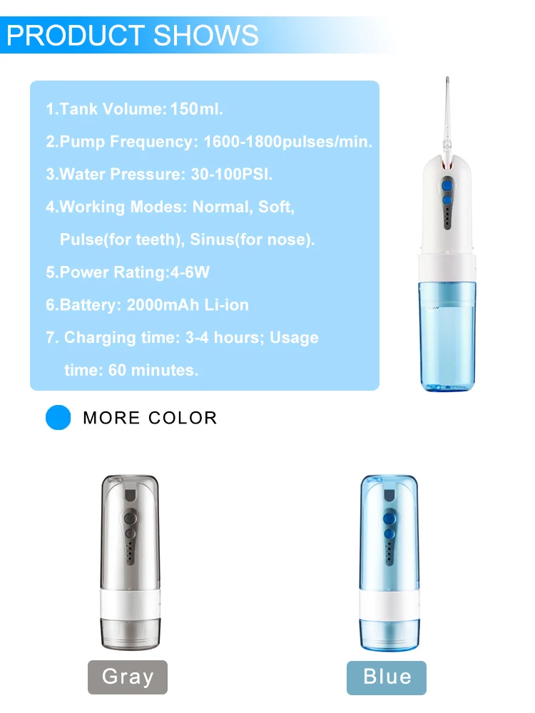 Color Box Packaging | 1*oral irrigator, 1*USB cable, 1*manual, 1*travel bag, 3*standard nozzle, 1*periodontal nozzle, 1*nasal nozzle. | ||||