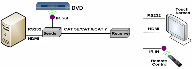 Connectors | Transmitter: 1 x HDMI Type-A, female (in) 1 x RJ45 Ethernet connector 1 x 3-Pin phoenix connector for RS232 serial 1 x 3.5 mm jack (IR out) 1 x DC power jack |