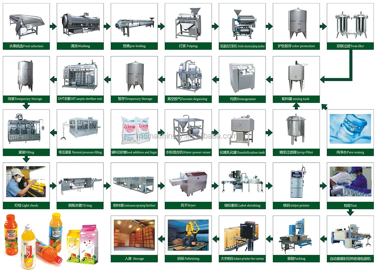 Taken various fresh fruit , juice concentrate, juice powder as main raw material, through dilution, extraction, cooking, grinding, homogenization, degassing and filling etc flow procedures, which can be manufactured into various fruit juice, flavor juice beverage.