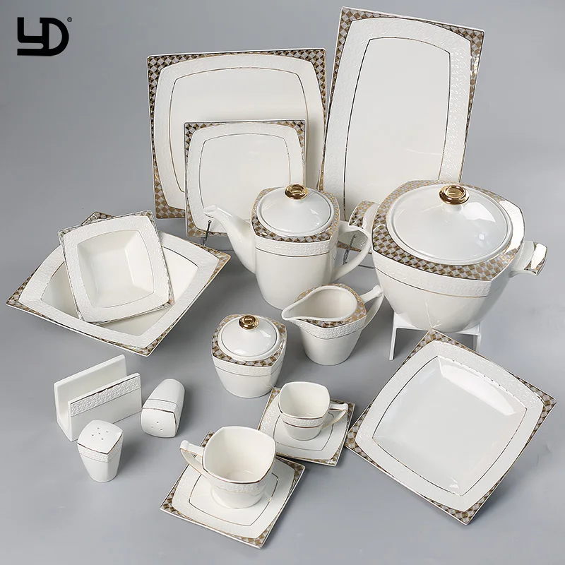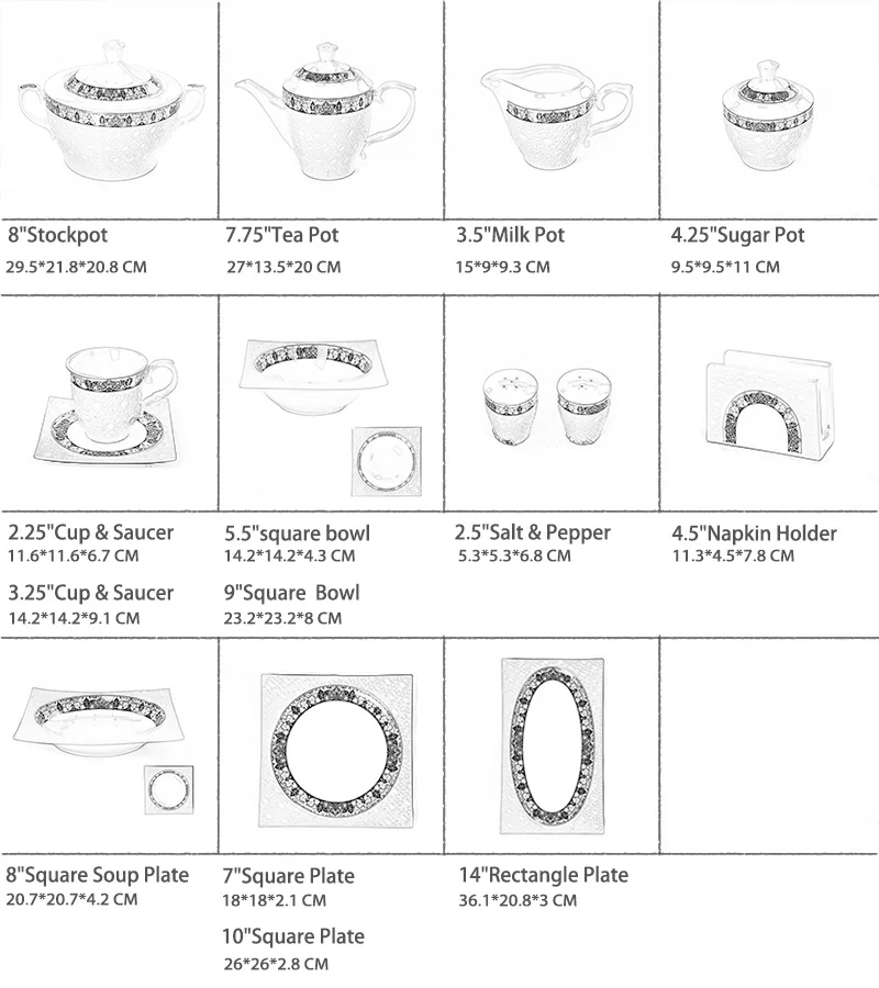 56 pcs | tea pot 1 + sugar pot 1 + milk pot 1 + cup&saucer 6 + stockpot 1 + big spoon 1 + soup spoon 6 + 7''plate 6 + 8"square soup plate 6 + 10''plate 6 + 14"rectangle plate 2 + soup tureen 2 + 5"square bowl 6 + 9"square bowl 1 + salt and pepper 1 + napkin holder 1 |