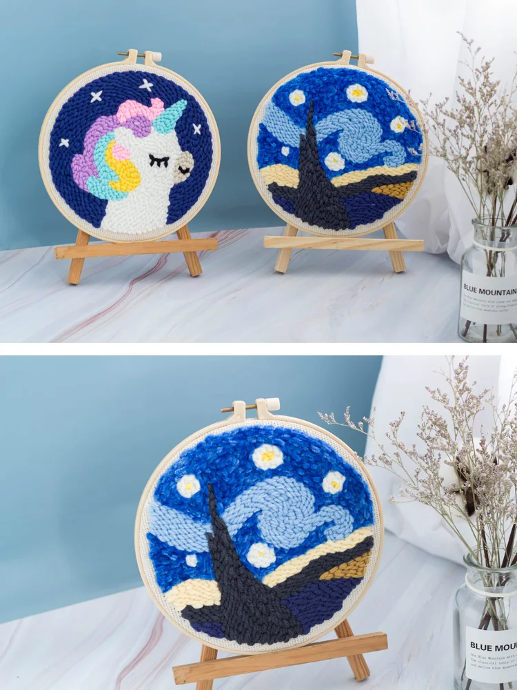 The embroidery diy kit contains enough high-quality colour thread,Cotton fabric with High-temperature--erasable pattern ,20CM Beige bamboo-like plastic embroidery,punch needle and needle threader. Instructions.