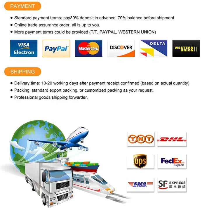 30% deposit, 70% against the copy of B/L. Also we can accept Trade Assurance, Western Union, Paypal terms, and LC at sight for large order.
