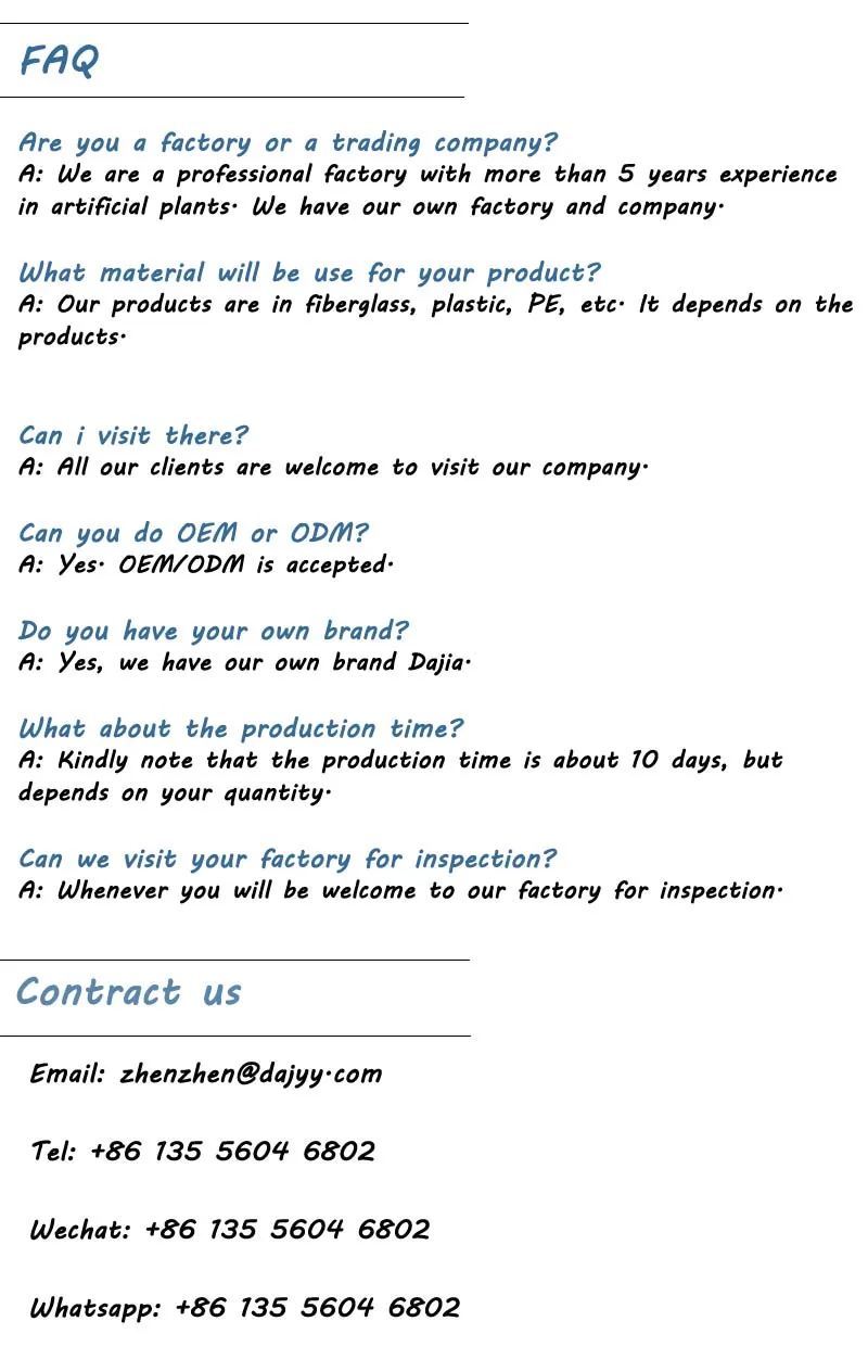 Guangzhou Dajia Landscape Ltd. is a professional manufacturer of artificial grass wall, artificial flower, artificial tree, artificial small bonsai, artificial plant, artificial sculpture.