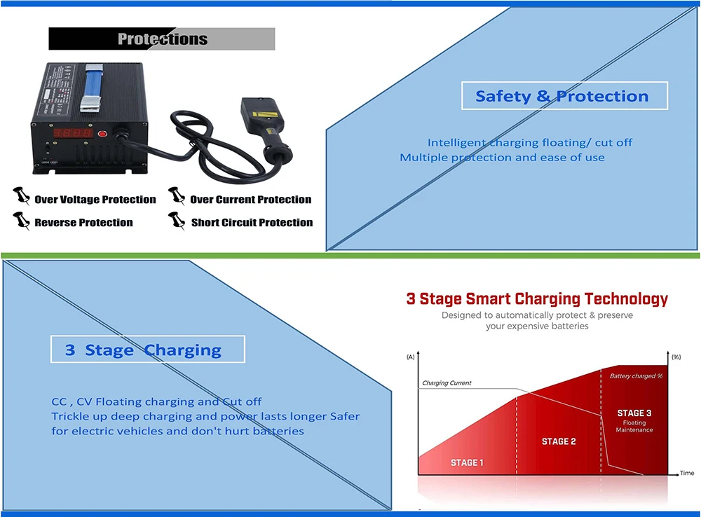 Protection | Over Current, Over Voltage, Over temperature, Short Circuit, Reverse Polarity, shut off or trickle and anti-reverse charge. | ||