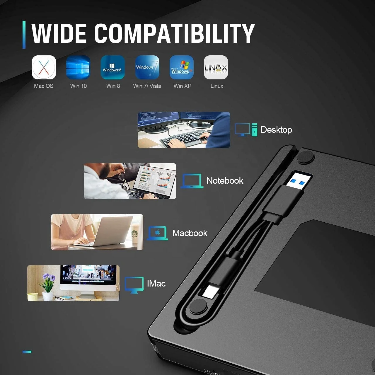 CD-ROM/DVD-RM Reader and Writer adds Type-C adaptor, which can support various devices. Compatible with Windows 2000/2003/XP/7/8/10, Vista and all versions of Mac OS systems, Apple MacBook Air and MacBook Pro.