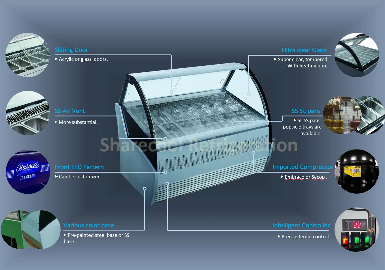 Sharecool Refrigeration was established in 2007. Through years of hard-working and efforts, We have now developed as a professional, reliable manufacturer and supplier of commercial refrigeration products such as stainless steel kitchen equipments, ice storage bin, ice cream showcase, cake showcase, etc. The customers can choose from our product list, or we can manufacture according to the customers' designs and requirements.