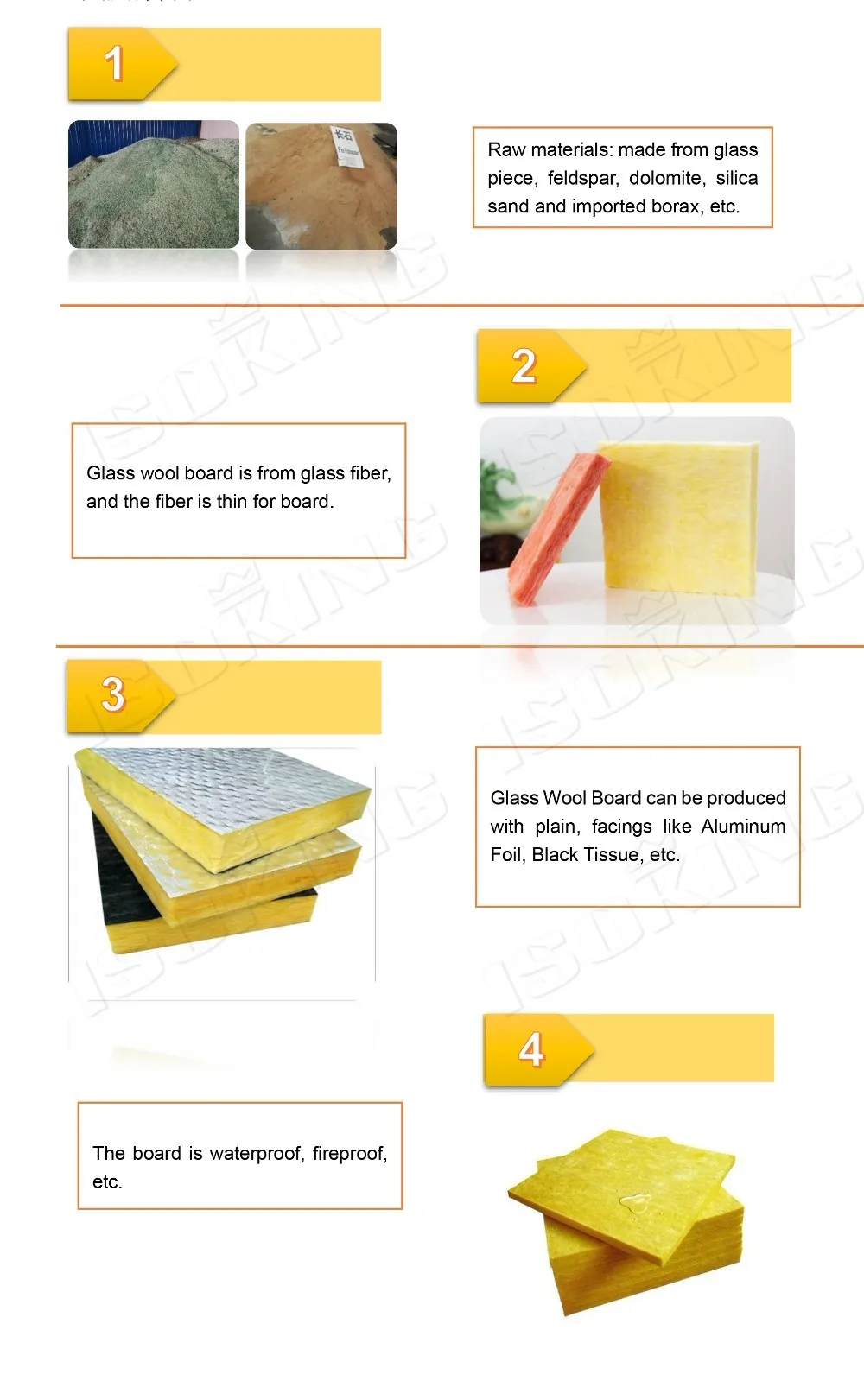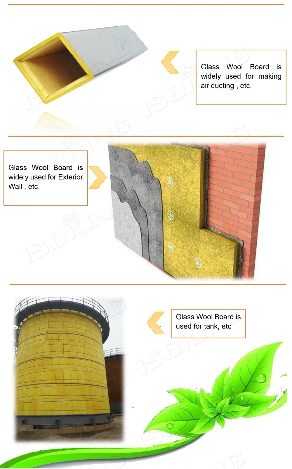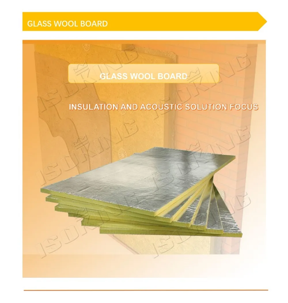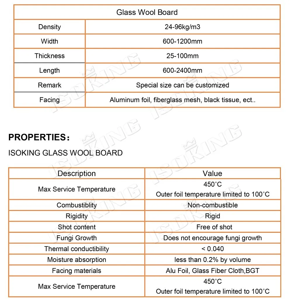 ISOKING™ Glass wool board is made of glass pieces, dolomite, silica sand and fledspar, mainly used for drywall, partition, duct board and roofing insulation, have excellent thermal and soundproof performance.