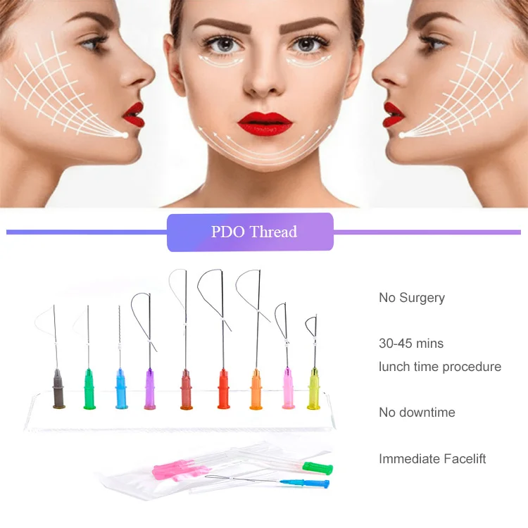 The PDO Thread (Ploydioxanone), was originally a heart suture for heart surgery, on which it developed into a beauty line. It is inserted into the superficial skin by using a spiral plug wire (beauty thread) that can be absorbed and dissolved by the human body, thereby stimulating the regeneration of collagen under the skin. The protein wire is implanted in the body and slowly absorbed and absorbed by the body. The skin and fascia layer are continuously stimulated during 6-8 months. The muscle tissue that has been stiff or drooping is re-arranged, and the fiber sub-cells in the skin are activated to produce collagen.