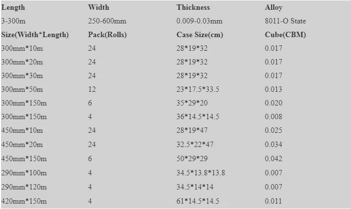The Specification of the aluminium foil rolls: