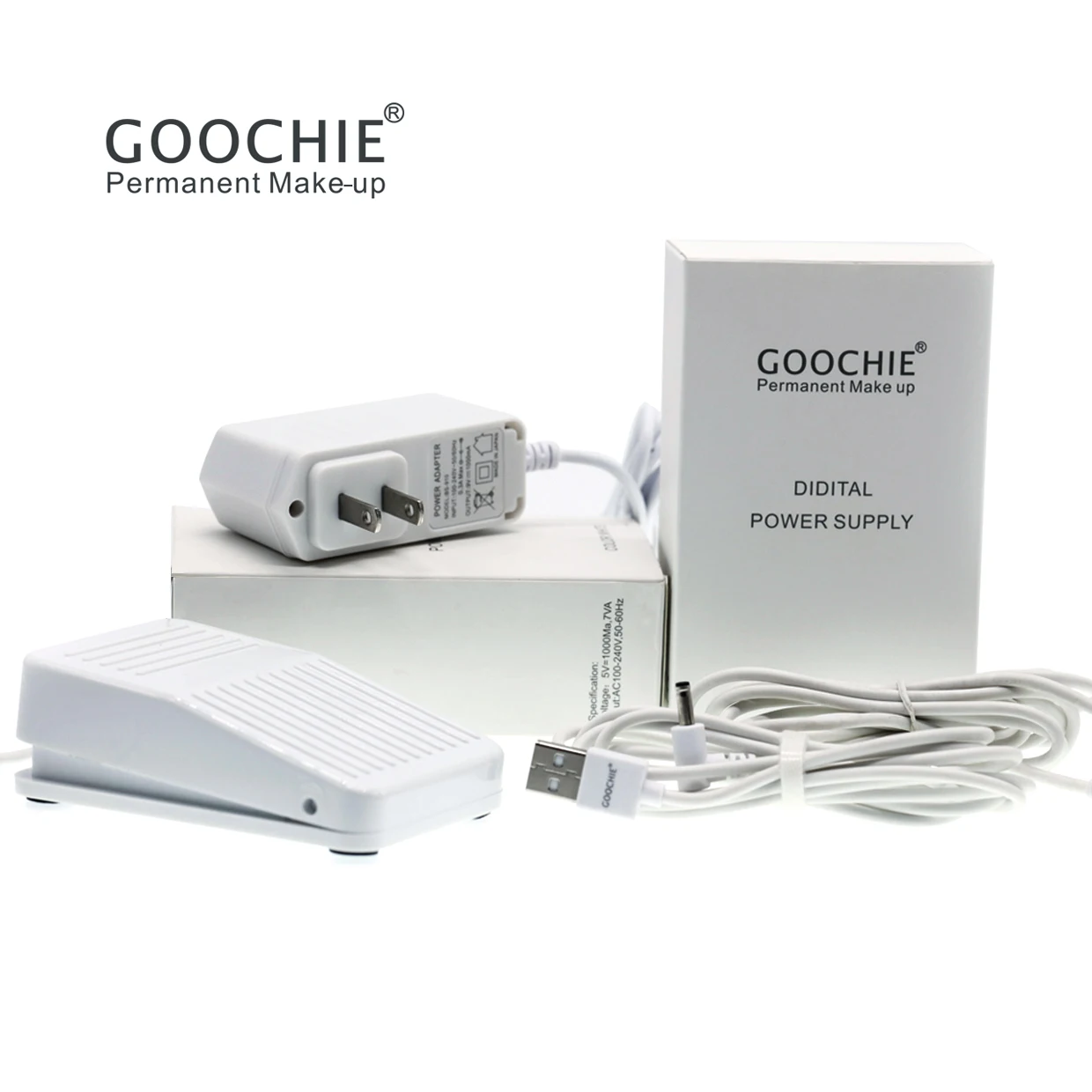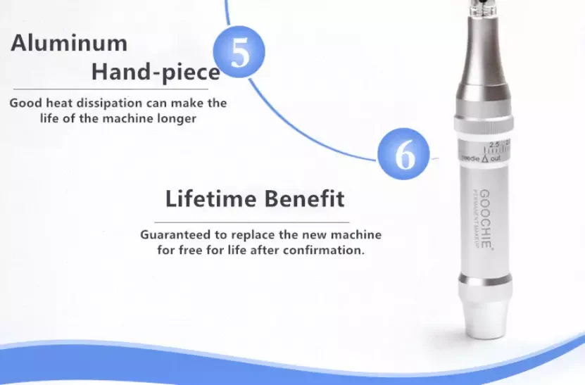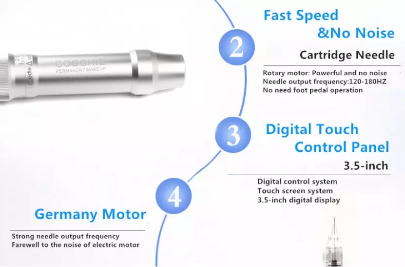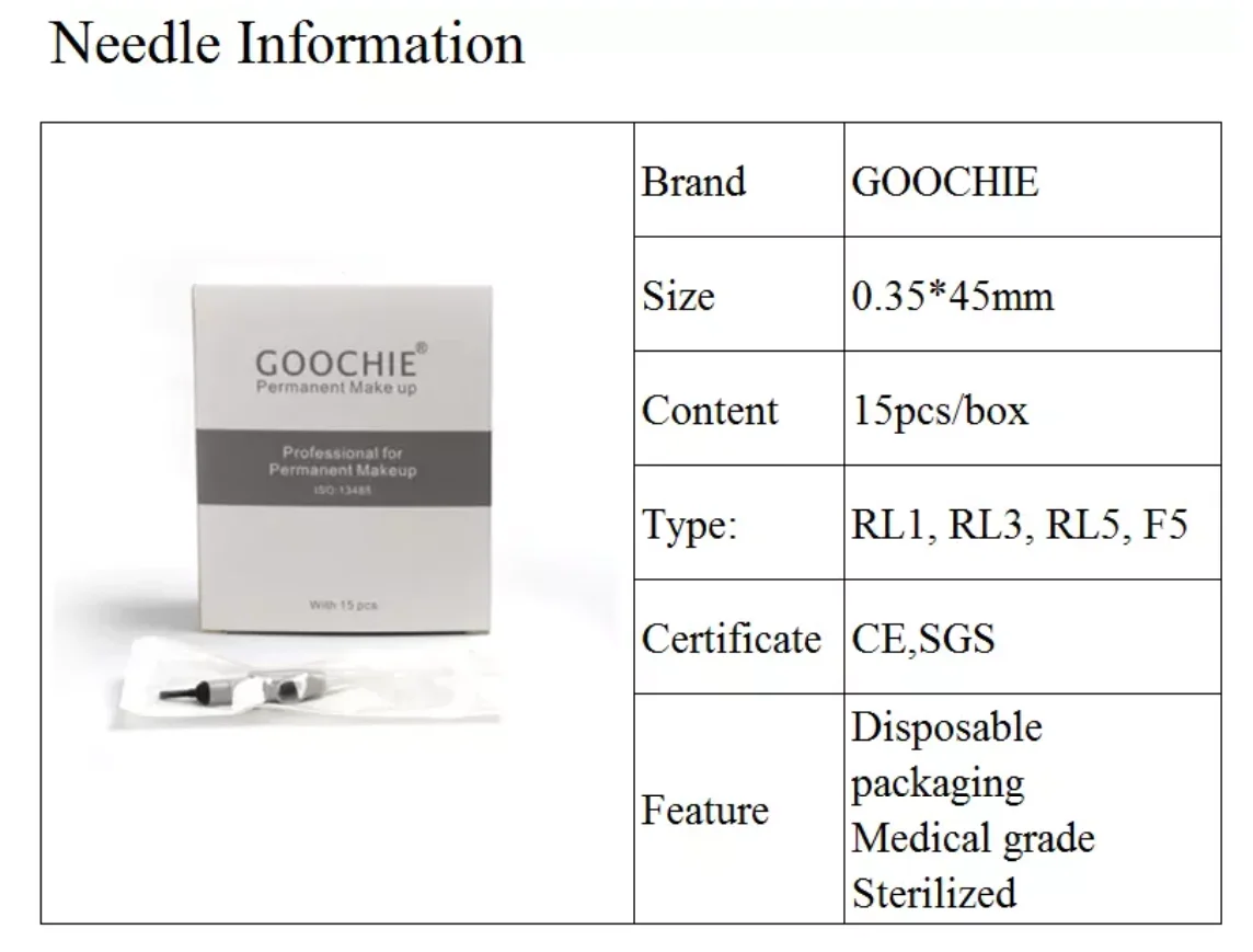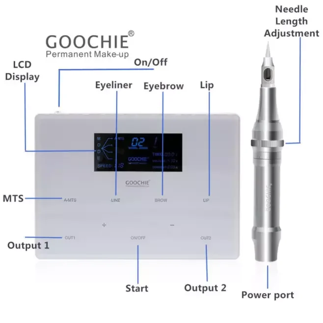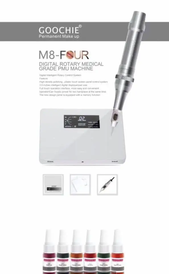 Full kit of Permanent Make-up Machine/Goochie M8-4 1 set of intelligent control panel 1 piece of cartridge-type hand piece 1 box of power supply 1 cord and 2 USB connecting line 1 box of single needle (15 pieces) 1 pc foot pedal Package weight: 2.5KG Outer packing size: 310*310*60mm