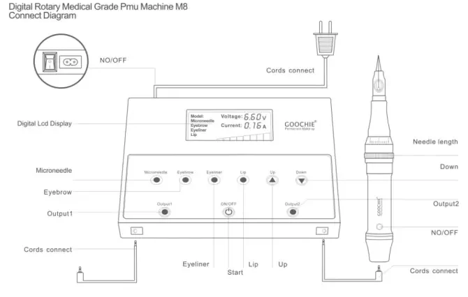 1. Please connect the parts according to the Connect Diagram 2. Choose a suitable needle cartridge, insert it into the hand piece with calibration set to zero. 3. Press the switch (ON/OFF button) to turn on the control panel 4. Press Output1 or Output2 to start the hand piece 5. Press the pen's on button. When the machine is running, adjust to the proper needle length and start operation. The recommended needle length is: Eyebrows: 1-1.5mm, Lips: 0.8-1.2mm, Eyeliner 0.8-1mm 6. Choose the right operation button 7. During process, press the speed regulator to adjust the speed of the hand piece 8. After the operation is completed, turn off and clean the machine.
