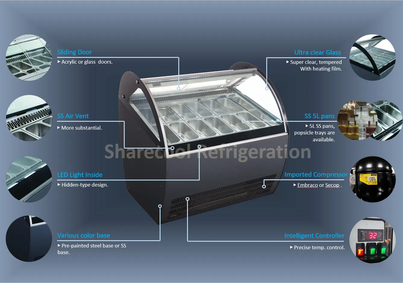 Sharecool Refrigeration was established in 2007. Through years of hard-working and efforts, We have now developed as a professional, reliable manufacturer and supplier of commercial refrigeration products such as stainless steel kitchen equipments, ice storage bin, ice cream showcase, cake showcase, etc. The customers can choose from our product list, or we can manufacture according to the customers' designs and requirements.
