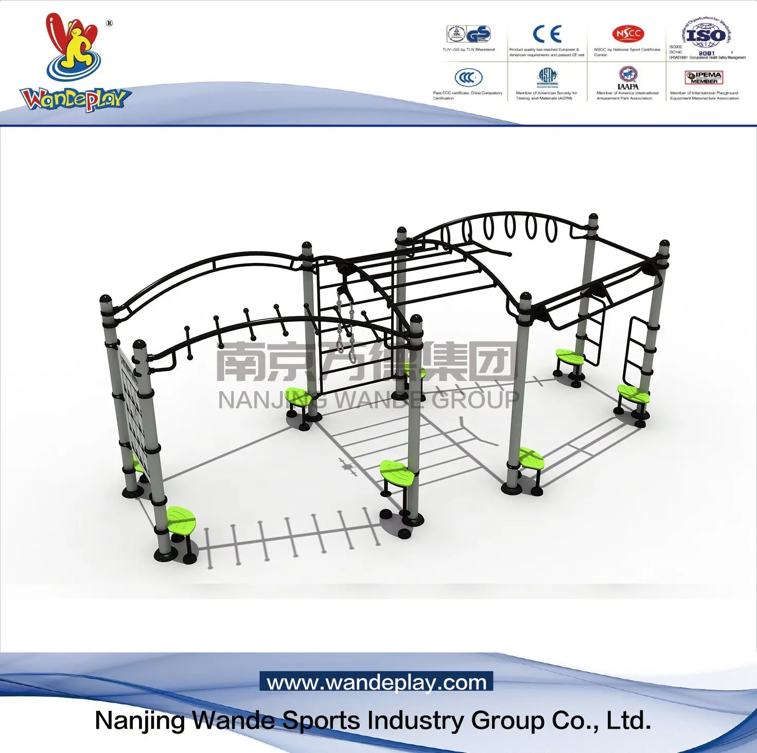 A: Our Children Playground Equipment and Outdoor Fitness Equipment are made of galvanized steel Φ114mm/Φ48mm/38mm/32mm*2.5mm/2.0mm and painted with non-toxic electrostatic paint, free of lead and cadmium, 100% safe for health and the environment, All the fasteners are made of stainless steel and the plastic parts are made of linear low density polyethylene (LLDPE).